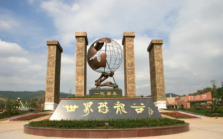這是世界恐龍谷標(biāo)志性雕塑——[一代霸主]。黑色大理石基座上一只恐龍前爪化石托起一個(gè)侏羅紀(jì)時(shí)期的地球模型,向我們傳達(dá)出恐龍作為中生代地球霸主的王者之氣。