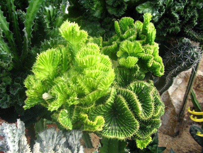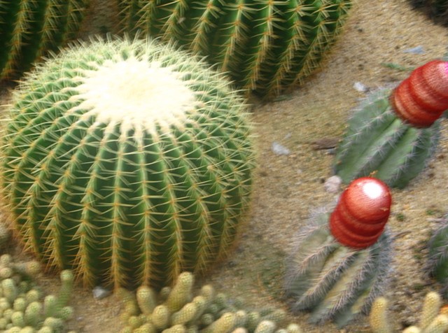 玻璃房為門式鋼架結(jié)構(gòu),跨度分別為10m與8m,高分別為7.4m與7m。甲號玻璃房保留了原有知名的神秘果、墨西哥油梨、夷蘭香、金蓮木、咖啡等熱帶植物,片植鳳梨科植物,營造熱帶植物成林,小道藏于林間、迂回曲折,植物種類豐富,生長茂盛,行于其中數(shù)尺之外可聞其聲不見其人,如同進(jìn)入南美熱帶森林。乙號玻璃房調(diào)整了景觀格局,遍地砂礫,行人穿梭沙丘曲行而過,以地生、氣生、附生鳳梨植物配以園林小品替換原有肉質(zhì)植物,使人宛若置身于沙漠之中。