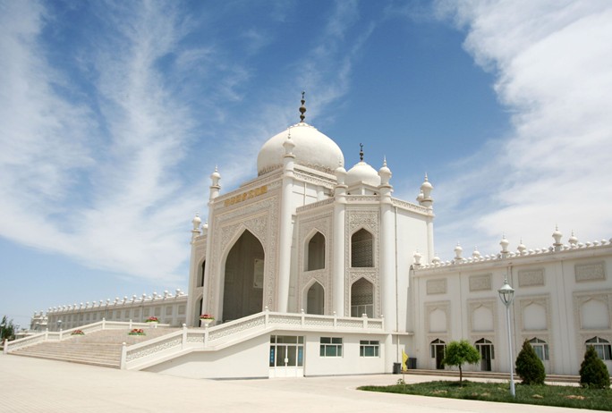 中華回鄉(xiāng)文化園主體大門是借鑒印度泰姬陵設(shè)計建造的。她高38米,長206米,即便是站在很遠的地方也能夠看得到她的身影。站在她的面前,她的高大、偉岸、恢宏,給你以視覺的沖擊。走近她,她潔白的身軀、飽滿的穹頂、絢麗的浮雕、繽紛的彩繪、精巧的結(jié)構(gòu),在藍天白云的映襯下,給你的是心靈的震撼。來到這里,你會被她濃郁的伊斯蘭風格所吸引、所感染、所陶醉;你會明白什么是圣潔的天堂;你還會深深的感受到,來到這里心靈即將經(jīng)受一次伊斯蘭文化的洗禮。這是建園人的夢想,也是所要達到的目的,更是中華回鄉(xiāng)文化園所要突出的主題。