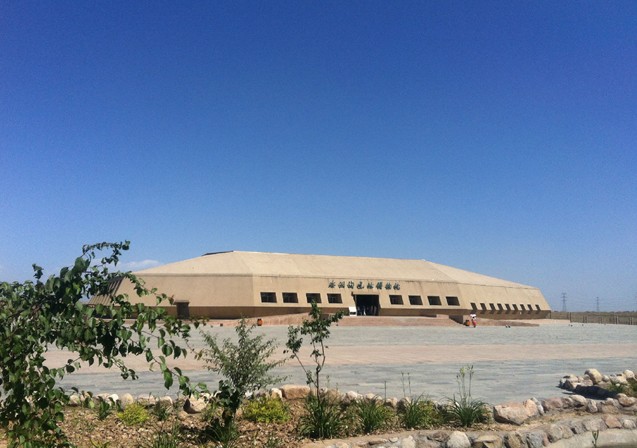 水洞溝遺址博物館建筑面積4308平方米,外形仿水洞溝出土的石器,是我國西北地區(qū)唯一展示舊石器時代文化面貌的主題博物館。它在傳統(tǒng)博物館參觀性功能的基礎上融入藝術性、文學性和高科技的創(chuàng)新元素。以270度超大型半景畫、實景、幻影成像等展示形式,結合世界最先進的聲、光、電、可調式地震平臺等技術的運用。
