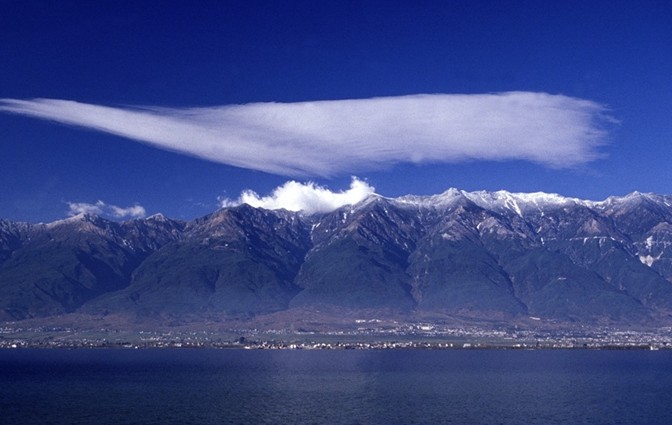 蒼山云景變幻萬千,其中最有名的是“望夫云”和“玉帶云”。望夫云每年冬春季節(jié)常出現(xiàn)于玉局峰頂,這云出現(xiàn)后洱海隨即狂風大作掀起陣陣驚濤駭浪,漁船不能出海,因此望夫云又被稱為“無渡云”。玉帶云不僅嫵媚動人,而且按白族農(nóng)諺所說,她還是豐收的預兆:“蒼山系玉帶,餓狗吃白米”。