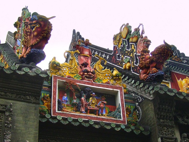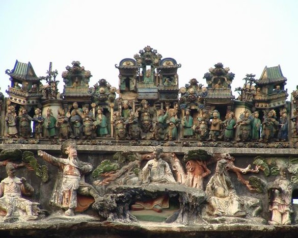 陳氏書院的陶塑五彩繽紛,琳瑯滿目,令人目不暇接。書院的正脊采用佛山陶塑共11條。首進(jìn)5條和聚賢堂脊飾分別于光緒十七年(1891年)(聚賢堂脊飾 于1976年被臺(tái)風(fēng)刮倒,于1981 年重塑)和十九年(1893年)燒制,中、后進(jìn)的4條脊飾于光緒十八年(1892年)燒制,后進(jìn)大廳的脊飾則完成于光緒十六年(1890年)。11條脊飾中以聚賢堂的規(guī)模最大,其總長27米,高2.9米,連灰塑基座總高達(dá)4.26米。全脊共塑224個(gè)人物,題材包括八仙賀壽、加官進(jìn)爵、虬髯客與李靖等,整條脊飾恰似一個(gè)巨大的舞臺(tái)。其他脊飾的題材主要是龍鳳、花鳥、瑞獸、山水以及歷史故事和人物群像等。