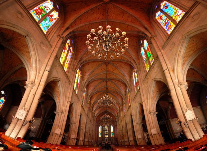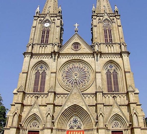 該教堂正面是一對(duì)高聳的尖頂石塔,象征升向天堂,皈依天主;石塔中間西側(cè)是一座大時(shí)鐘,石塔中間東側(cè)是一座大鐘樓,裝有四具從法國運(yùn)來的大銅鐘;西邊鐘樓的西、南、北三個(gè)塔面安裝有羅馬字鐘面的時(shí)鐘,東邊鐘樓內(nèi)懸掛著以圣母瑪利亞命名的銅鐘組;正立面的鐘樓上聳立尖塔,是哥特式教堂建筑風(fēng)格的特征,也是建筑造型藝術(shù)魅力的內(nèi)是尖形肋骨高叉的拱形穹窿;正面大門上面和四周墻壁分布的花窗欞,都是合掌式,所有門窗都以法國制造的較深的紅、黃、藍(lán)、綠等七彩玻璃鑲嵌。這玻璃可避免室外強(qiáng)光射入,使室內(nèi)光線終年保持著柔和,形成慈祥、肅穆的宗教氣氛。充分展現(xiàn):尖塔為空心的八角形錐體,用石塊砌成,其下是三層樓房,尖塔越往上越陡峭,最后像錐尖刺向蒼穹。