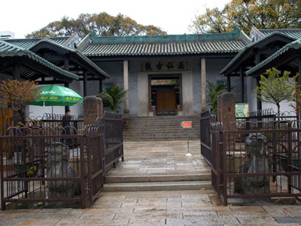 五仙觀位于惠福西路。現(xiàn)寺觀建于明洪武七年(1337年),是一座祭祖五仙的谷神廟。該觀屬道教寺廟,寺坐向南,門上大匾上有清人書寫的“五仙大觀”四個大字。五仙觀依山而建,現(xiàn)存有頭門、后殿、東齋與西齋。五仙觀為綠琉璃瓦重檐歇山頂,木構(gòu)架保存完好,玲瓏新巧。后殿東側(cè)裸露的一塊紅砂巖,上有巨大的腳印凹穴,古人一向認為這是“仙人拇跡”,重點保護下來。明清兩代,這里分別以“穗石洞天”和“五仙霞洞”列入羊城八景。