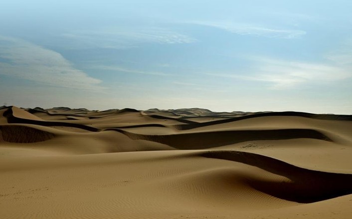 地形地貌復(fù)雜,多為鏈狀新月形沙丘。沙海邊為東北-西南走向的沙垅,中部隆起,形為魚脊。也有的沙丘呈方格狀,稱格狀新月形沙丘。站在高丘上四望,眾多沙丘彼此相連,如大海波濤,起伏不平。