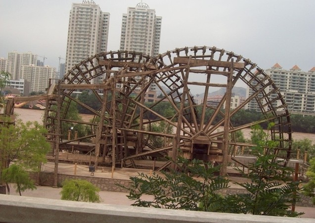 黃河水車幾百年來(lái),世事滄桑,水車在原有引流灌溉的主要功能上,同時(shí)附加了豐富的旅游內(nèi)涵,我們所看到的龍灣水車是1999年為發(fā)展石林旅游而重新修建的,水車有48個(gè)水斗,輻條36根,軸心到地面是7.8米,水車直徑為8米,它利用水流推動(dòng)掛水板,驅(qū)使水車徐徐轉(zhuǎn)動(dòng),水斗依次舀滿水,緩緩上升,至上方時(shí),水斗口朝下,將水傾倒掌盤(pán),再入水槽,引流水渠。
