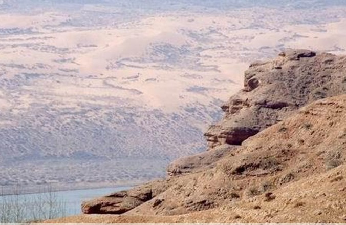從沙坡頭乘快艇穿越黃河抵達河對岸的“q”形島,穿過大灣村向南迤邐而上,登上一座建有涼亭的小山包,放眼西望,但見500米開外,有一處紅褐色的小山包群,與周圍的沙丘和灰褐色山體形成了強烈的反差。 這紅褐色的山包群南側(cè)臨河處有2座突出的山頭,注目遠眺,但見一對雄雌雙獅豁然躍入眼簾:突前的一塊山巖分明是雄獅大而圓的鼻子;往上是棱角分明的眼眶和一雙乍醒徽啟的眼睛;再往上直到山頭的頂部,仿佛是扁平的額頭和卷屈飄逸的毛發(fā)。
