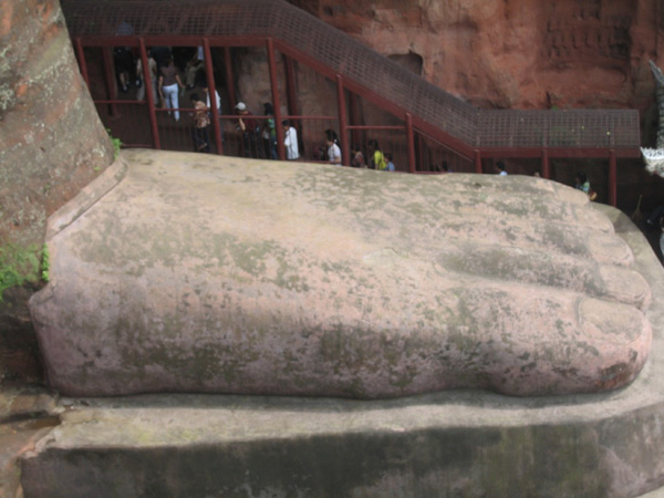 凌云山各峰上的寺宇,現(xiàn)在還保存的有棲巒峰的凌云寺和靈寶峰的靈寶塔。凌云寺規(guī)模頗大,大佛就鑿于離寺不遠(yuǎn)的崖上。從這里可以沿一條鑿于懸崖邊上的陡直小路,下到大佛的腳邊,在此憑欄看佛,可以仔細(xì)觀賞大佛頭部各個(gè)部位的細(xì)微之處。因?yàn)榇蠓痂徲诹柙扑虑埃源蠓鹨簿头Q為凌云大佛。而凌云寺也因有了這尊大佛,而被人們稱為大佛寺。凌云山有了大佛,山更出名,大佛在凌云山上,山更增色。