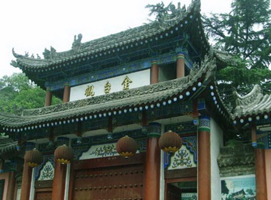 金臺觀位于中國寶雞市金臺區(qū)北坡森林公園半坡處,創(chuàng)建于元朝末年,為明代道士張三豐修道處。觀分中院和東、西偏院三部分,主要道教古跡與建筑有山門、玉皇閣、呂祖殿、圣母殿、張爺?shù)?、三清殿、慈航殿、八卦亭、圣母洞、三豐洞、藥王洞、朝陽洞等,多依山就勢而建。登臨觀中,遠望秦嶺疊嶂,環(huán)列如 屏,翠色欲滴,俯視渭水縈回若帶,市區(qū)高樓林立,山色秀麗,萬千景象,一覽無余。為寶雞三大道教宮觀(金臺觀、銀臺觀、玉臺觀)之一。