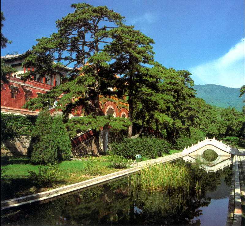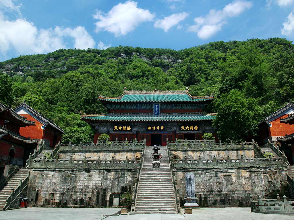 位于武當(dāng)山東南的展旗峰下,始建于北宋宣和年間(公元1119一1125年),明永樂(lè)十一年(公元1413年)重建,明嘉靖三十一年(公元1552年)擴(kuò)建,清嘉慶八年至二十五年(公元1803—1820年)大修,是武當(dāng)山八大宮觀中規(guī)模宏大、保存完整的道教建筑之一。現(xiàn)存有建筑29棟,建筑面積6854平方米。中軸線上為五級(jí)階地,由上而下遞建龍虎殿、碑亭、十方堂、紫霄大殿、圣文母殿,兩側(cè)以配房等建筑分隔為三進(jìn)院落,構(gòu)成一組殿堂樓宇、鱗次櫛比、主次分明的建筑群。宮的中部?jī)梢頌樗暮显菏降牡廊司铀?。宮內(nèi)主體建筑紫霄殿,是武當(dāng)山最有代表性的木構(gòu)建筑,建在三層石臺(tái)基之上,版權(quán)所有聊城聊之旅旅行社有限公司,轉(zhuǎn)載必究!臺(tái)基前正中及左右側(cè)均有踏道通向大殿的月臺(tái)。大殿面闊進(jìn)深各五間,高18.3米,闊29.9米,深12米,面積358.8平方米。共有檐柱、金柱36根,排列有序。大殿為重檐歇山頂式大木結(jié)構(gòu),由三層崇臺(tái)襯托,比例適度,外觀協(xié)調(diào)。上下檐保持明初以前的做法。柱頭和斗栱顯示明代斗杠的特征。梁架結(jié)構(gòu)用九檀,高寬比為5:2.5,保持宋遼以來(lái)的用材比例。殿內(nèi)金柱斗栱,施井口天花,明間內(nèi)槽有斗八藻井。明間后部建有刻工精致的石須彌座神龕,其中供玉皇大帝,左右肋侍神像,均出自明人之手。