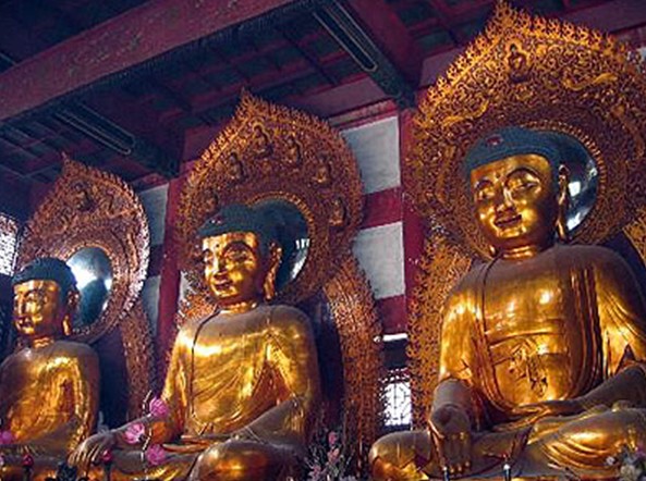 ◎1983年,在塔之西重建大雄寶殿,供奉清康熙二年(公元1663年)以黃銅精鑄的三尊大佛像。 ……