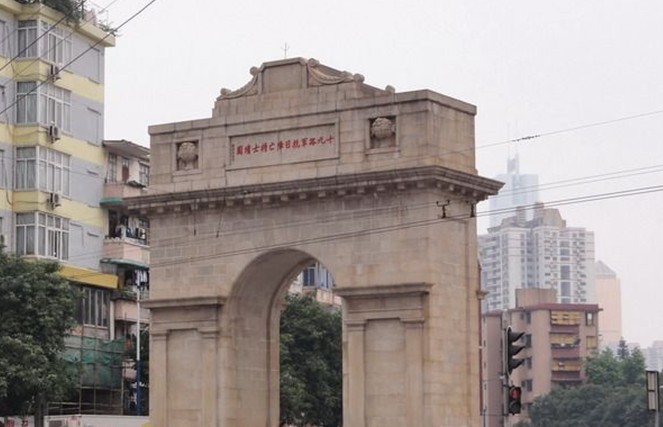 陵園有一座花崗巖砌成的仿羅馬紀(jì)功式建筑凱旋門。門樓建于1932年,位于沙河頂、先烈路和水蔭路的交會(huì)處,高13.4米,寬 11米,占地面積 40.7平方米。門額正面鐫刻著原國(guó)民政府主席林森所題的“十九路軍抗日陣亡將士墳園”,背面鐫刻國(guó)民政府行政院長(zhǎng)宋子文題寫“碧血丹心”。