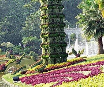 滟湖的水沿中軸線下瀉,使得滟湖成為中軸線的源頭,為了突出這一源頭,園林設計者和建造者又在滟湖的岸邊,建一羅馬柱廊,既突出了軸心線上的景點在云臺花園的作用,又與具有東西合璧特色的花園大門相對應。版權所有山東聊城聊之旅國際旅行社有限公司,轉載必究!更為有趣的是,建造者借鑒了蘇州園林中花墻的效果,在羅馬柱廊的后面又安放了一群圖騰石柱。在軸心線的兩側,云臺大花園分別排列出不同的功能區(qū),200多種中外名貴四時花卉就被巧妙地種植在不同的功能區(qū)里。東側在種植各種花卉的同時,還依地勢起伏培植了大面積的草坪,遠遠望去,酷似一條綠色的瀑布。西側是誼園和茶室。誼園中心是一巨大地球石雕,以地球石雕為圓心,在一個巨大的圓周內,分布著已與廣州結為友好城市的市花和友好城市所在國的國花。