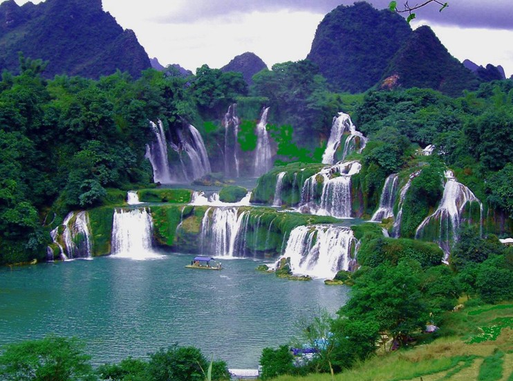 這里一年四季景色各異,雄奇瑰麗,變幻多姿,碧水長流,永不涸歇。春日,紅棉怒放,燦若云霞;夏臨,青峰浴水,花木繁茂;秋至,金風(fēng)送爽,遍地金黃;冬來,群峰峭拔,山色空濛。無論陰晴云霧,季節(jié)交替,總是各具情態(tài)。五百里畫廊更是一路展開一幅又一幅寧靜抒情的南國風(fēng)情畫卷。山巒從翠,奇峰錯列,輕紗繚繞,霞落云飛,山影平湖,茂林翠竹,花草掩映,百鳥低徊,綠水梯田,民居水車,小橋流水,耕夫荷鋤,村童在小河中嬉水,竹筏在秀水中穿行……這些如畫美景又豈是簡言陋語能描述、丹青妙手所能繪的呢?來吧,來德天,讓我們拋開一切煩囂,融入這大自然的懷抱!