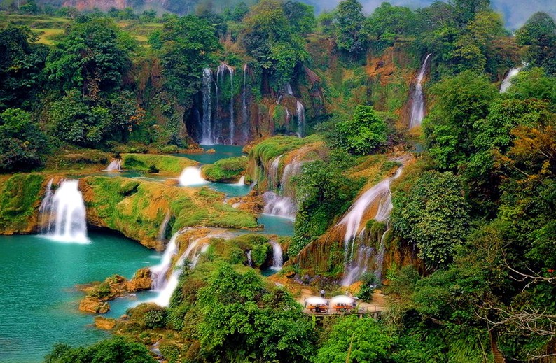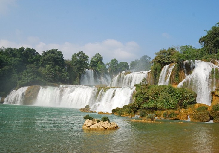 德天瀑布雄奇瑰麗,變幻多姿,碧水長流,永不涸歇。瀑布四季景色不同,春天凌草泛青,山花吐艷,瀑布四周被鑲起五彩繽紛的花邊;秋天梯田鋪金,層林盡染,高掛的銀簾霧氣沖天;冬天瓊珠閃閃,玉液潺瀑,山風(fēng)把細流吹得飄飄灑灑;夏天激流如 龍,排山倒海,似萬馬奔騰而來。