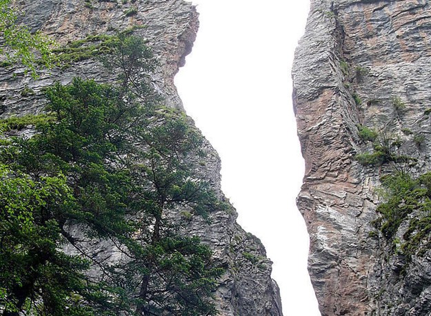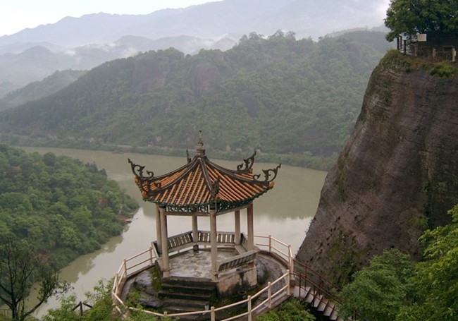 一線天又名靈巖,位于武夷群峰的西南端,是武夷的最奇的巖洞,素有“鬼斧神工之奇”的稱號。一線天,存在在九曲溪二曲南面的一個幽邃的峽谷中。里面一座巍然挺立的巨石,長數百丈,高千仞,名“靈巖”。巖端傾斜而出,覆蓋著三個毗鄰的巖洞:左為靈巖洞,中為風洞,右為伏羲洞。從伏羲洞而入巖內,到了深處,抬頭仰望,但見巖頂裂開一罅,就像是利斧劈開一樣,相去不滿一尺,長約一百多米,從中漏進天光一線,宛如跨空碧虹,這就是令人嘆為觀止的一線天。
