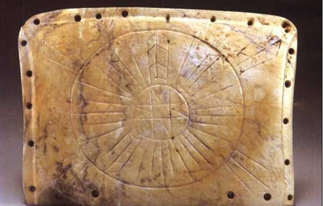 玉版正面為長方形,反面略內(nèi)凹,兩短邊各對鉆5個圓孔,一長邊對鉆9個圓孔,另一長邊在兩端對鉆2個圓孔。玉版中部雕刻有一個圓圈,圈內(nèi)雕刻著方心八角 星紋;圈外雕一大橢圓形,兩圓以直線平分為八等分(每等分雕刻一圭形紋);在橢圓外沿圈邊對著長方形玉版的四角各雕刻一圭形紋飾。版權(quán)所有山東聊城聊之旅國際旅行社有限公司,轉(zhuǎn)載必究!這塊玉版上雕刻的紋飾,反映了5000年前凌家灘先民的原始哲學思想,即圓中心的八角星紋應代表太陽;小圓圈外、大圓圈之內(nèi)的八個圭形紋飾應是表示東、西、南、北和東南、東北、西南、西北等八方;大圓圈外四角的四個圭形紋飾應是表示四維。四維和八方,可能就是《史記•龜策列傳》中記載的所謂“四維已定,八卦相望”。按照凌家灘遺址的年代推測,玉版應該是“三皇”時代的原始八卦圖。