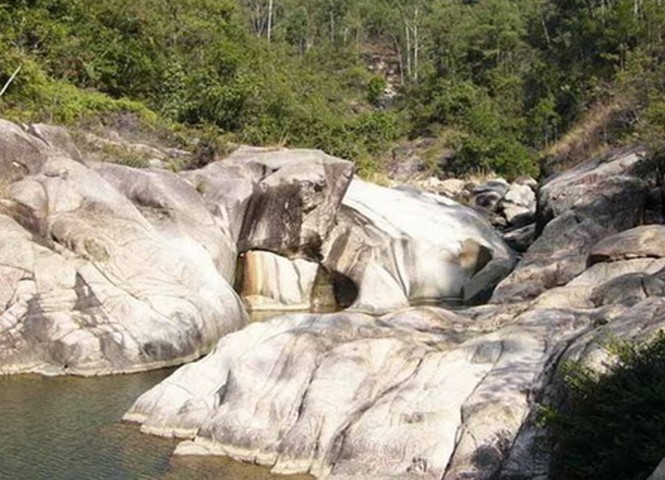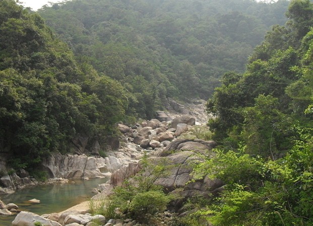 良田河深入8、9公里,那莽莽蒼蒼的原始次生林遮天閉日,深邃的峽谷亂石層層疊疊,又被溪水沖刷得千瘡百孔。這里既有花崗石因垂直節(jié)理發(fā)育而形成的如劍劈斧砍的裂縫,又有花崗石特有的球狀風化形成的石蛋,也有流水夾帶礫石沖刷巖體形成的甌穴。