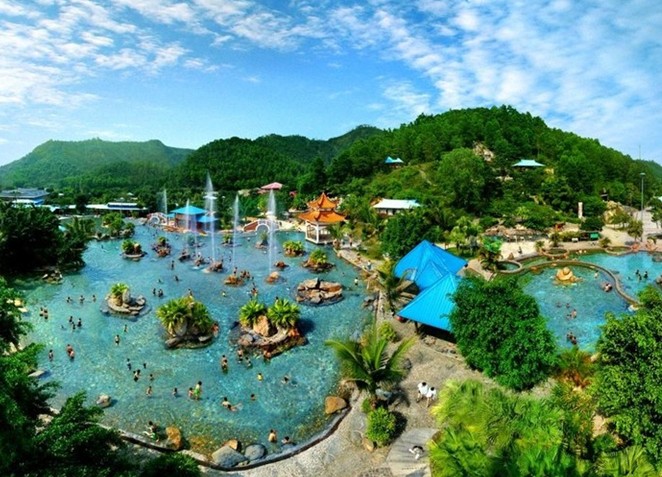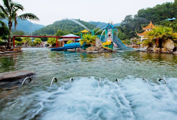 浴區(qū)內(nèi)有多處自噴溫泉,日流量為6000立方米,其溫泉水溫高達(dá)73℃,水質(zhì)晶瑩幼滑,并含有偏硅酸、氟、氫、硫等多種有益于人體健康的元素,屬優(yōu)質(zhì)醫(yī)療溫泉及罕有的溫滑泉。