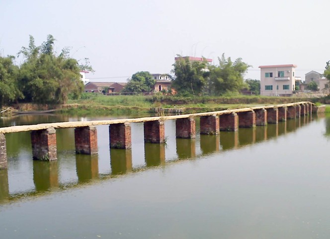 沿著彎彎的鄉(xiāng)間小路,可來到古勞水鄉(xiāng)一處名叫“二渡橋”的地方。只見前面的圍墩上,有幾棵百年老榕,靜靜地鎮(zhèn)守和護(hù)衛(wèi)著這一方水土。榕蔭下,幾塊長條花崗巖石條曲曲折折地架在魚塘邊的木樁上,頗有一種“小橋流水人家”的韻味。這種花崗巖石條,當(dāng)?shù)厝朔Q它“條石”或“西樵石”。因水鄉(xiāng)的泥土細(xì)滑,不易滲水,偶爾幾滴小雨,這里便遍地泥濘,行走不便。于是居民們便用這種“條石”沿著小河涌和糖基鋪路,形成了遍布水鄉(xiāng)的石板小橋和石板小路,構(gòu)成一幅獨(dú)特的風(fēng)景。