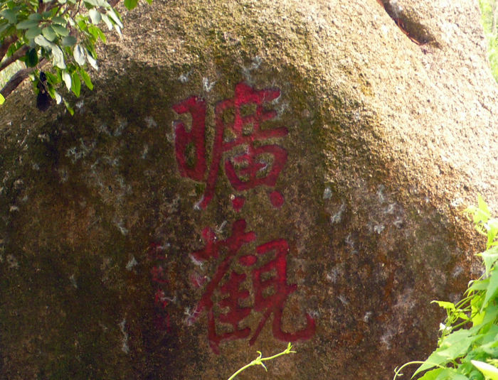 登上崖頂"石溪"巖石右側(cè)一圓石刻著"曠觀"兩字。南眺遠山如黛,玉盤一樣的香洲區(qū)盡收眼底。當年名士多聚于此,豪飲放歌賦詩懷古,留下累累筆墨石刻,因年代久遠,現(xiàn)存僅三十余處。石溪摩崖時刻群大多取意于環(huán)境、石貌、如"茂林修竹"、"樵徑"等游人至此,如臨一座書法展覽館,趣味橫生。