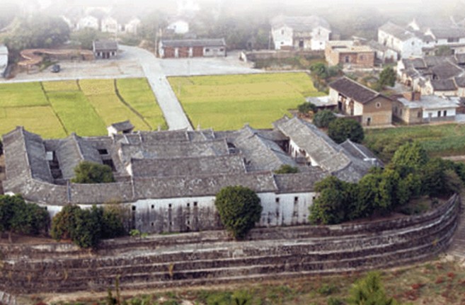 殿堂式,是在閩西的“府第式”基礎(chǔ)上改進(jìn)而成的、模仿古代中原官邸府宅的建筑形式。這種建筑一般是“三堂二橫一圍”或“三堂二橫四圍”。所謂“三堂”,就是依宅基中軸線建造橫列的上、中、下三座堂。每座堂中間是大廳,兩旁為廂房。下堂(前廳)用作迎賓接客或偶爾停棺入殮;中廳常為長(zhǎng)輩議事、節(jié)慶設(shè)宴之所;上堂(祖堂)供奉先祖牌位。堂與堂之間以天井分隔。每堂大廳兩邊還有對(duì)稱的兩廂或四廂,作書房、花廳或習(xí)武場(chǎng)所,其余按輩分居祝所謂“二橫”、“四橫”,就是在堂的兩旁,分別建一排或兩排與中軸線平行(縱向)的房屋,給族內(nèi)各房人丁人祝屋后是封閉的,屋后和兩側(cè)的外墻一般不開窗。若開著,也是窄長(zhǎng)的小石窗,作向外瞭望和射擊之用。這種屋的外墻特別厚實(shí),常以石灰、黃泥、沙石的“三合土”夯成,有的還以條石作墻基,上砌夾層青磚,所以堅(jiān)固耐用,百年不倒。當(dāng)全部外門關(guān)閉,外墻如同一道防御工事,整座大宅就活象一座城堡。