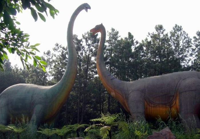 按照1:1的比例設(shè)計(jì)制作的兩條仿真恐龍栩栩如生。較高的是梁龍,身體背部為綠色,尾巴特別長(zhǎng)達(dá)16米,脖子也接近13米長(zhǎng),身體總長(zhǎng)達(dá)40米,身高達(dá)22米,堪稱目前世界上最高、最大的仿真恐龍!在它旁邊的身高稍矮、體型稍小一點(diǎn)的巨龍也并不能小看,棕黃色的身軀也有18米之高,體長(zhǎng)近40米。