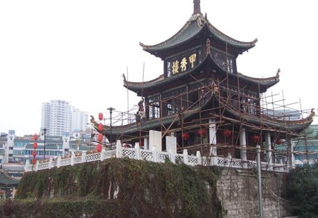 待度山山頂矗立著“甲秀樓”古塔。據(jù)說甲秀樓建于清嘉慶十年(1850年)。為兩層泥塔,高15米,呈六角形,似葫蘆蓋頂,塔尖直指藍天,造形獨持,十分壯觀。