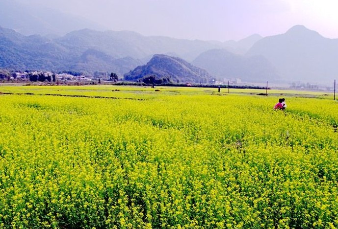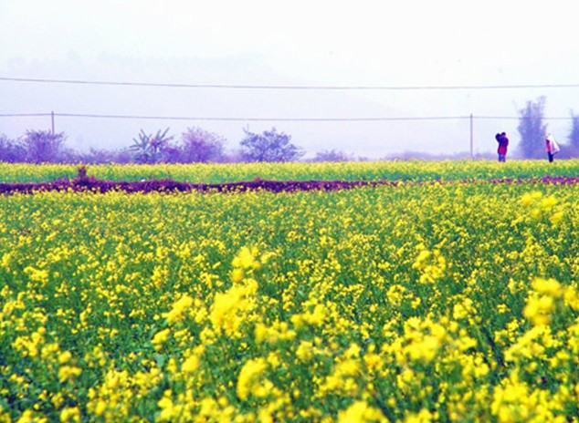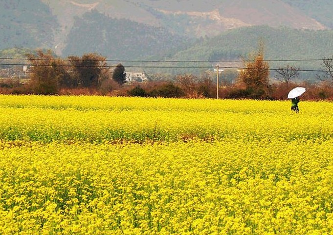 油菜花期,葉少枝繁,虬須互繞,姿豐勢旺。朵朵黃花巧著翠莖,緣下盤上,漸次綻開,撫枝細點,單株菜花均超千朵,體碩株壯者則花數(shù)難計。當微吹吹過,花朵輕搖,田野里一望無際的金色花海便仿若一層層的波浪,高低起伏,不斷向游人涌來,百里飄香。