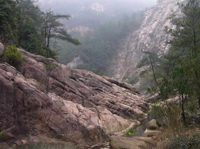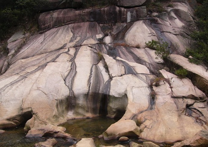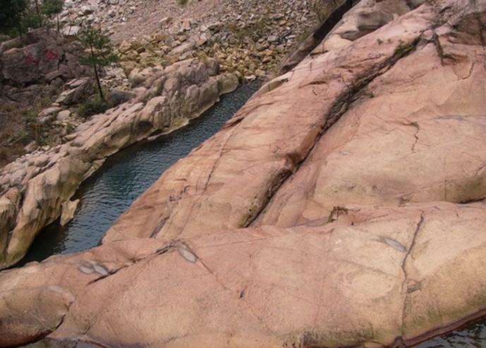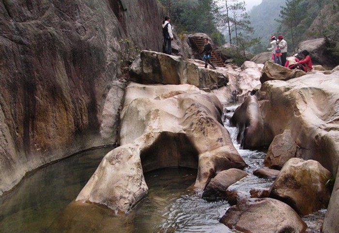 奇石群:數(shù)十塊10—50噸的巨石,經(jīng)過(guò)百萬(wàn)年水的沖刷,表面紋理不一,有似魚(yú)鱗、浮雕、地圖等,其中有一塊酷似毛澤東的狂草手書(shū)。