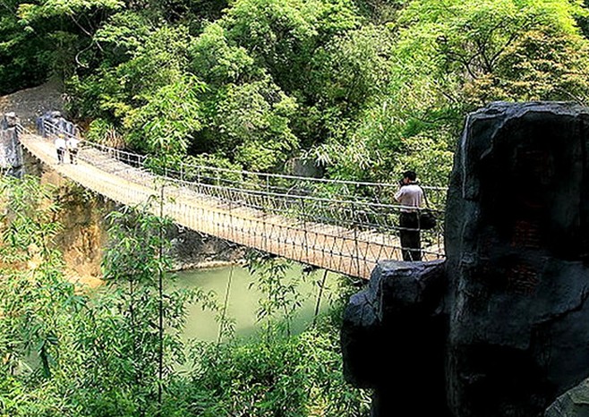 仙人橋位于縣城西南40余公里處的洛陽鎮(zhèn)半星雷屋村,高山斜坡上、綠樹掩映間,有大、小拱天然仙人橋兩座,屬石灰?guī)r溶蝕地貌景觀。大拱橋高70米,寬50米,長150米,小拱橋更為壯觀,高約138米,內(nèi)拱高106米,寬53米,長約156米,在大拱仙人橋的入口處,有峰巒延綿,勢如雄獅回首南望,獅身高約38米,長約60米,獅頭、獅眼因石灰?guī)r溶蝕脫落而成,形成了“雄獅回頭”的獨特景觀。