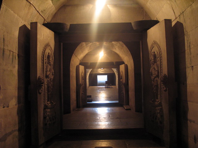 盡管清廷的遺臣為修建崇陵費盡心思,光緒還是沒有能夠在他的地下寢宮里平安地長眠下去。1931年軍閥混戰(zhàn)時期,一伙不明身份的兵匪盜掘了崇陵地宮,多數(shù)隨葬品被劫走。1980年6月,經(jīng)上級批準(zhǔn),清西陵文物管理處開啟地宮,清理整修,供國內(nèi)外游客參觀。這座地宮墓道全長63.19米,是無梁無柱的石拱券式建筑,共有四道石門、九座券。門樓、門垛、門框、門簪均用青白石作原料,雕有瓦脊、瓦壟、花瓶等圖案,每道石門上都有巨大的銅鑄門管扇,八扇石門上分別雕有八大菩薩立像,金券內(nèi)有寶床,寶床正中有金井,光緒皇帝和隆?;屎蟮墓讟⊥7旁趯毚采?,棺槨周圍有用五彩繪制的龍山石16塊,寶床前東西各有石座兩個,座上有香箱,是存放“冊”、“寶”用的。這座地宮雖已被盜,但仍出土珠寶玉翠等文物數(shù)百件。