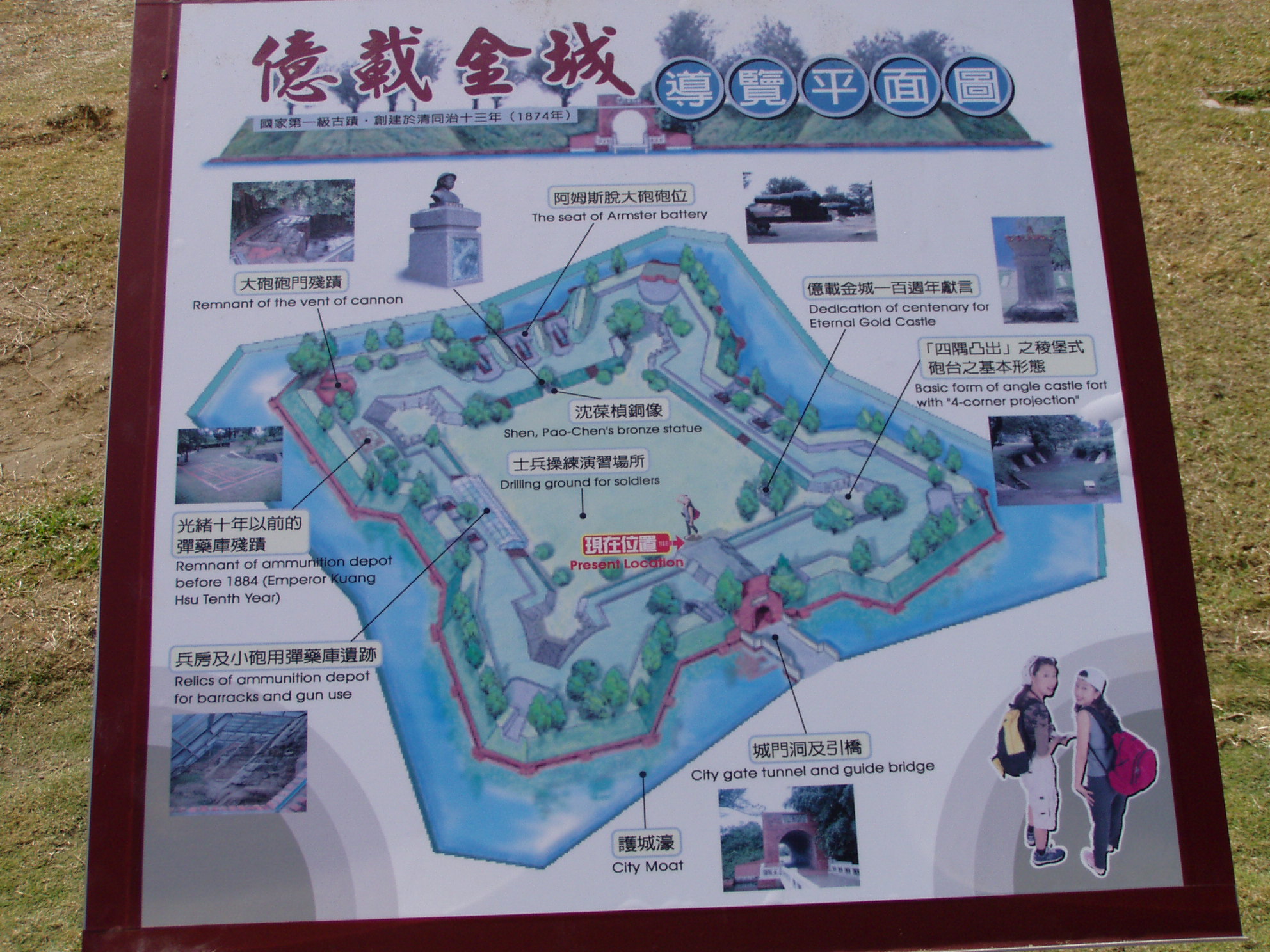 億載金城是于清同治13年(公元1874年),也就是日本借口牡丹社事件同年開始建造,完工時間為清光緒2年(公元1876年),億載金城占地約3公頃,為西洋式紅磚建筑,呈四方形,四隅有棱堡,而中央凹入的場地則是用來操練軍隊,城外引海水為護(hù)城壕,城上設(shè)有大炮,故稱大炮臺,另稱安平炮臺、三合土炮臺、抗日名城,目前列為國家第一古跡。