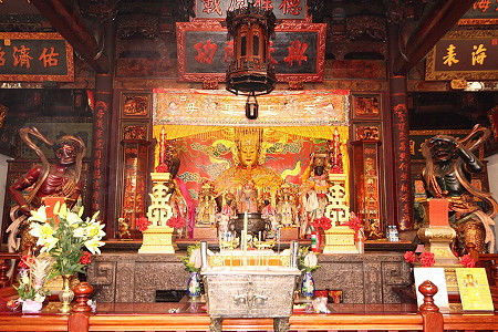 大天后宮為三進(jìn)門式。由大門朝里望,透過三進(jìn)逐次升高的天井和房舍狹長(zhǎng)的空間,可以遙見那香煙繚繞、金黃帷幕下的全身媽祖神像。媽祖慈眉善目,神態(tài)安詳。據(jù)說媽祖原來(lái)是粉紅面,但經(jīng)百年來(lái)受香火的薰繞,現(xiàn)在看到的媽祖已成了黑色的“香煙面”了。兩旁配祀千里眼、順風(fēng)耳二將的泥雕,表情細(xì)膩,體態(tài)生動(dòng),古銅色的肌膚、一塊塊突起的肌肉,顯得極為兇猛威嚴(yán),雕刻精細(xì)入微,栩栩版權(quán)所有聊城聊之旅國(guó)際旅行社有限公司,轉(zhuǎn)載必究!如生,實(shí)為雕刻精品。兩邊的神龕里還供奉著東、西、南、北四海龍王和水仙尊王。神奇古怪,嶙峋不凡,也都被煙薰成了黑臉。這些都是與海上的航海、救難有關(guān)的神。該廟還有一個(gè)特色就是除了正殿的媽祖稱為大媽外,還配有所謂的“二媽”、“三媽”的媽祖神像,造型僅為大媽的一半,臉色為粉紅色,兩眼張開,與媽祖神像眼瞼呈下垂?fàn)畈煌?/p>