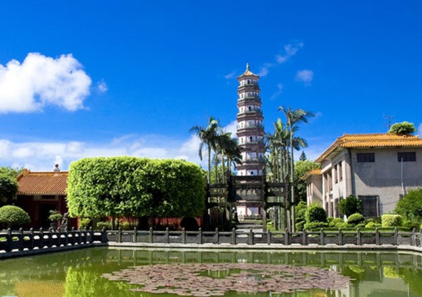 于明萬歷四十一年(1613年)元月興工,至萬歷四十三年(1615年)四月落成。初命名“文魁塔”,又稱“啟秀塔”。后因挖塔基時(shí)發(fā)現(xiàn)蛇卵三只,以以為是“三元及第”之兆,故改名為“三元塔”。在380多年前建筑工具簡(jiǎn)陋的情況下,雷州人民僅用約兩年時(shí)間就建成一座如此雄偉壯麗的高層古塔,至今已經(jīng)經(jīng)歷了將近400年的風(fēng)雪滄桑,雷轟地震仍巋然屹立,充分顯示了雷州人民的聰明才智和驚人的創(chuàng)造力。此塔坐東向西,樓閣式磚木結(jié)構(gòu),用棱角牙子磚和線磚互相疊澀出檐,下大上小,逐層遞減,比例勻稱。檐上有平臺(tái)、外廊,繞以欄桿。八觚九級(jí)、內(nèi)樓17層、高57米。塔基為石刻須彌座。八面共嵌有23塊陽(yáng)雕石刻,分別為“麟趾呈祥”、“鯉跳龍門”、“獅子戲球”、“三羊(陽(yáng))開泰”、“雙鳳朝陽(yáng)”、“喜鵲練梅”等,線條粗獷,形態(tài)生動(dòng),富有民族特色和地方風(fēng)格,為明代石刻珍品。每層設(shè)真、假門,呈圭角形。真門對(duì)開相連通,利用塔壁為階梯由下而上,穿過塔心室,繞平座(塔廊)、南入北出、東進(jìn)西升、盤旋而上,可達(dá)極頂。三元塔建成后,雷郡形勝大為改觀,“鼎峙瓊南添一指,聯(lián)翩雁字豫題名”。 版權(quán)所有山東聊城聊之旅國(guó)際旅行社有限公司,轉(zhuǎn)載必究!后來“雁塔題名”成為雷陽(yáng)八景之一。古往今來,不少騷人墨客、名宦顯貴慕名登臨,留下不少膾炙人口的詩(shī)文,其中明代海北南守道蔣光彥(福建晉江人,進(jìn)士)有詩(shī)贊道: