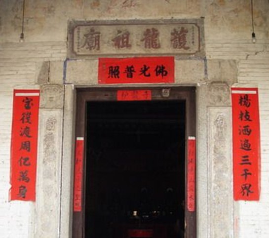 護(hù)龍祖廟在端州區(qū)黃崗鎮(zhèn)前村,始建于清初,同治十年(1871)重修。四周古樹(shù)懷抱,環(huán)境清幽,有小溪潺潺流過(guò),廟前遠(yuǎn)眺,田園秀色一覽無(wú)遺。廟為三進(jìn)院落四合院式布局,面積136平方米,大門上方鑲嵌楷書(shū)“護(hù)龍祖廟”石匾,前后殿為硬山頂,面寬進(jìn)深均三間,建筑物前設(shè)“低頭牽”,抬梁與穿十混合式梁架結(jié)構(gòu),兩殿之間以平面方形的卷棚頂廟亭相連,亭兩側(cè)空地邊緣,還用矮墻連貫前殿與后殿,使之渾然一體。該廟是肇慶市端州區(qū)目前保存最完整的廟宇。1984年公布為肇慶市文物保護(hù)單位。