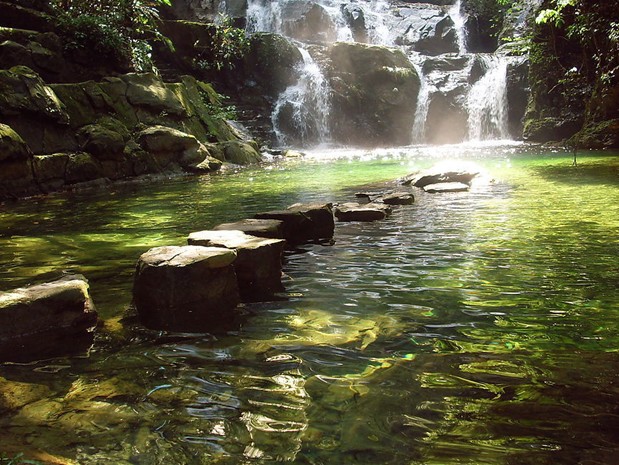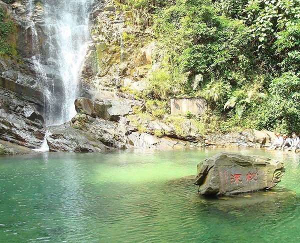 鼎湖山飛水潭,又名龍?zhí)讹w瀑,位于鼎湖山南半山腰、慶云古剎下東側(cè)。 去飛水潭,由榮睿碑亭拾級(jí)登山,沿曲徑云封直上,至半山腰向右拐,過眠綠亭即可。當(dāng)然,亦可在榮壑碑亭前面的山溪邊起步,一直溯溪而上。這里,山石嶙峋,瀑布從40多米高的崖頂深處狂奔而來,直往下飛瀉,忽而形成千尺飛流,如白練懸空,忽而濺作滿空雨花,如輕紗曼舞。瀑布下,如注的水流匯成一泓碧水,中有巨石,上刻“枕流”2字。辛亥革命后,孫中山先生偕夫人宋慶齡游覽鼎湖山時(shí),曾在此游泳,現(xiàn)崖壁上刻有宋慶齡手書的“孫中山游泳處”6個(gè)大字。潭水由此再往下傾瀉,版權(quán)所有山東聊城聊之旅國際旅行社有限公司,轉(zhuǎn)載必究!繼而形成另一個(gè)深潭,據(jù)傳為蟄龍窟,故曰:浴龍池。飛水潭側(cè)建有更衣室,崖間建有觀瀑亭,崖壁鐫刻著許多贊美飛水潭的摩崖大字和方寸小楷,如“噴雪”、“能移我情”、“天然圖畫”、“飛泉咽危石”等,頗有詩情畫意。 夏日到此,觀瀑、游泳、濯足,均感遍體清涼,煩熱頓消。