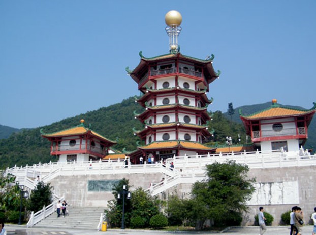 云修臺以北,即為關(guān)公財(cái)神廟。欲臨廟內(nèi),須登三層大臺階,拾級而上。每層臺階上都有一個四米進(jìn)深的小平臺,平臺墻壁上有精美的漢白玉浮雕,雕刻精美,每個浮雕都含一個題材,內(nèi)容廣泛。平臺欄桿皆為漢白玉,古樸典雅。最后兩組臺階之中,仿制故宮太和殿前臺階,各置兩塊雕龍石刻,騰云駕霧,張牙舞爪,氣度非凡。登上臺階,眼前展現(xiàn)出一座巍峨聳立的八角塔樓,名為“觀星樓”。塔高六層,白墻丹柱黃瓦,翼角圓窗,層層飛檐,八望如一,雍容大方,高古雄渾。塔頂立有二龍戲珠之寶珠。門前紅柱上有一聯(lián):“樓觀端州白云入,門對西江日月生。”端州白云,西江日月全囊其中,是畫龍點(diǎn)睛之妙對。走進(jìn)樓內(nèi),首層供奉著彌勒佛像,咧嘴大笑、袒胸露腹、盤腿而坐、手托元寶。旁懸一副對聯(lián)警世:“以忠厚相承積金皆由積德,為秀靈所聚多寶更要多賢。”四周壁架上陳列著端硯、奇石、觀音立像、臥佛等眾多藝術(shù)品,琳瑯滿目。自二樓到六樓,依次供奉著黑、白、黃、紅、綠五姓財(cái)神。這五位財(cái)神,是由印度財(cái)神演化而來。登上觀星樓頂層,步出閣外,憑欄遠(yuǎn)望,其開闊之勢更甚于云修臺,仰觀蒼穹,白云日月似可手摘;俯瞰眼前,云修秀臺儼然腳下;平視遠(yuǎn)方,肇慶全景盡收眼底。版權(quán)所有山東聊城聊之旅國際旅行社有限公司,轉(zhuǎn)載必究!星湖如鑒,七巖若棋,西江似帶。下樓出閣,見一大院,院北中軸線上坐落著賜財(cái)寶殿,院東乃好運(yùn)閣,院西為忠義軒。院中有池,壽龜、錦鯉、仙鶴全納其中。賜財(cái)寶殿白墻黃瓦,與觀星樓色調(diào)統(tǒng)一,重檐歇山頂。大門有一聯(lián):“莫笑我竹骨泥身許個愿試試,別管你玉衾錦衣燒柱香瞧瞧。”殿內(nèi)主供正財(cái)神趙公明,神情肅穆、氣度威儀,輔奉福、壽、祿、喜神和利市天官等16尊神像,形態(tài)各異,栩栩如生。出寶殿,向東進(jìn)好運(yùn)閣,祀奉文財(cái)神范蠡,閣內(nèi)長聯(lián)精煉概括了范蠡生平:“應(yīng)怨大樹招風(fēng),高功見疑,陶朱事業(yè)原無奈;贏得紅顏知己,青史傳美,煙水生涯聊可娛。”向西望忠義軒,見門聯(lián):“儒稱圣釋稱佛道稱天尊,漢封侯明封王清封大帝。”儒釋道三教皆祀關(guān)公。漢封“漢壽亭侯”,宋封“昭烈武安王”,明封“協(xié)天大帝”,清封“忠義神武靈佑仁勇威顯護(hù)國保民精誠綏靖翊贊宣德關(guān)圣帝君”。入殿視關(guān)公像,鳳眼雙睜,蠶眉上挑,絕倫逸群。神像旁又有一聯(lián):“數(shù)定三分扶炎漢,伐魏討吳,辛苦備嘗,未了平生事業(yè);志在一統(tǒng)佐熙朝,伏魔蕩寇,神威遠(yuǎn)震,只完當(dāng)日精忠。”是關(guān)公一生經(jīng)歷的概述。