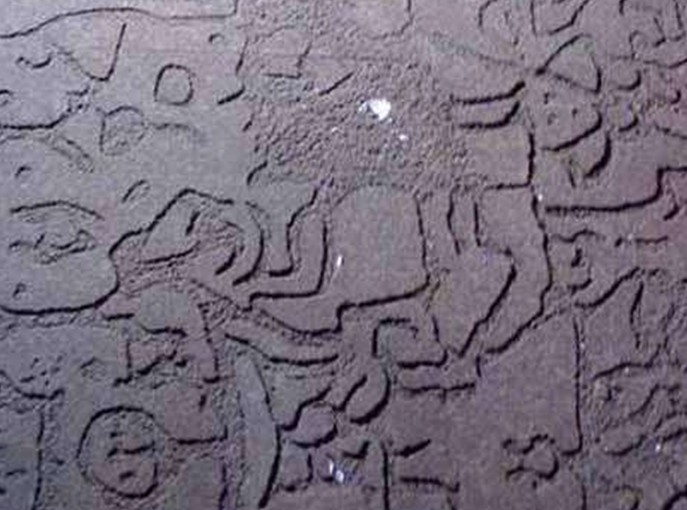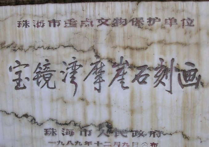 寶鏡灣摩崖石刻畫(huà),位于廣東珠海市高欄島寶鏡灣,于1989年10月被發(fā)現(xiàn),共4處6幅,散布于海灣所在的山腰、山麓200米范圍內(nèi),其中最大的一幅長(zhǎng)5米、高3米。巖畫(huà)陰刻于大塊平整的石面上,圖案密集而復(fù)雜,形狀有船、波浪、龍蛇、舞蹈人等,經(jīng)專家考證,是距今二三千年前青銅時(shí)代的產(chǎn)物,是南越先民生活的寫(xiě)照。