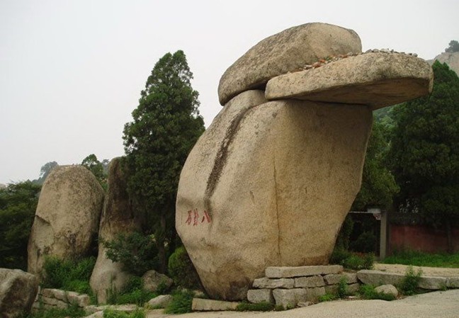 八卦石 八卦石是古代嶧山的五大奇觀之一。奇就奇在這兒原來有八塊大石頭,由東向西依次排列,高度相當(dāng),每塊石面都有斷紋。八塊石頭的斷紋正好與《周易》八卦的卦爻相吻合。非??上У氖牵逵赫哪辏?726年)修奎星閣毀掉了幾塊石頭。嘉慶十二年(1807年)拓建通明天宮戲樓,又毀掉了幾塊石頭?,F(xiàn)在只能看到乾、坎、艮三卦的卦爻了。