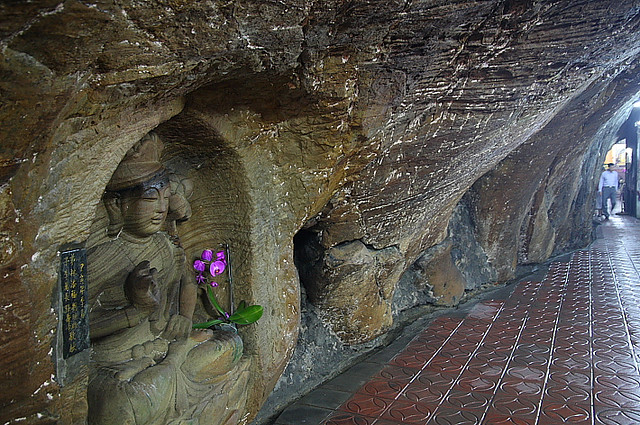 沿著石洞入內(nèi),燈光更為昏暗,但仔細(xì)看兩旁壁上,栩栩如生的石凋佛像,一尊尊的鑿壁而居,地藏菩薩、千手千眼觀世音菩薩、釋迦牟尼佛 ‥貧尊莊嚴(yán),更是引人入勝。