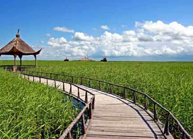 當(dāng)奈濕地位于黑龍江省大慶市杜爾伯特蒙古族自治縣煙筒屯鎮(zhèn)境內(nèi),扎龍國家級(jí)自然保護(hù)區(qū)腹地,總面積57萬畝,據(jù)考證,是目前亞洲已知僅有的兩塊原生態(tài)濕地之一?,F(xiàn)在仍然保持著完整的原始風(fēng)貌,大小湖泊星羅棋布,生物類別多種多樣,這里有丹頂鶴、大雁、野鴨等珍貴鳥類200多種。每到夏季,藍(lán)天碧水,蘆葦蕩漾,群魚戲蓮,百鳥歡歌。由于地勢(shì)低平,小興安嶺流下來的烏裕爾河和雙陽河在這里滯留成湖,演變?yōu)榇笃瑵竦?,總面積達(dá)3萬多公頃,濕地周圍水際生態(tài)系統(tǒng)交錯(cuò)替代形成的半濕潤半干燥的環(huán)境最具代表性的景觀是大片草原和蘆葦沼澤,在數(shù)萬公頃浩浩蘆葦蕩中,葦林如海,水網(wǎng)如織,景象壯美,是黑龍江西部地區(qū)極具特色的旅游資源。版權(quán)所有山東聊城聊之旅國際旅行社有限公司,轉(zhuǎn)載必究!當(dāng)奈一詞蒙古語謂“danghi ni ,蒙古語義是“仙女”或“女神”的稱謂。這個(gè)名字與古代杜爾伯特蒙古人母系文化崇拜有某種內(nèi)在的聯(lián)系和延續(xù)。當(dāng)奈曾經(jīng)有座蒙古喇嘛廟名叫“syalugqsum”,漢名普教寺建于公元1696年(清康熙三十五年),在它之前此地有否女神廟或女性敖包一類祭祀類型構(gòu)造物,當(dāng)奈的普教寺興建有這樣一個(gè)歷史傳說。當(dāng)奈屯附近的腰靈泡、花籃泡、納金泡葦蕩里春夏秋季節(jié)棲息著無數(shù)的野鴨、天鵝、仙鶴。有一年清康熙皇帝行獵到此,被一老者認(rèn)出,驚動(dòng)了周圍百姓,于是他們前來跪拜皇帝祈福,康熙大為感動(dòng),按百姓意愿賞銀建造喇嘛廟,并賜名普教寺,愿百姓吉祥。可惜這廟解放后被扒掉了,若存在該是308歲。當(dāng)奈人居生態(tài)村規(guī)劃本著保護(hù)濕地原有特色、變消極保護(hù)為積極的開發(fā)式保護(hù)的原則,將生態(tài)村建設(shè)成為大慶濕地核心旅游區(qū),我國濕地人地關(guān)系的標(biāo)準(zhǔn)景點(diǎn)和重要的濕地科研、科普教育基地。當(dāng)奈村民風(fēng)淳厚,民居古樸,農(nóng)家特色飯菜遠(yuǎn)近聞名。當(dāng)奈菜系為農(nóng)家菜系,有當(dāng)?shù)禺a(chǎn)的純天然的泥鰍魚、老頭魚、鯽魚、麥穗魚、柳根魚、嘎牙子以及珍貴的龍虱,還有自家產(chǎn)的茄子干、豆角干、干白菜等,主食有大餅子、包米碴子、小米飯等。是觀光、休閑、度假、科研的最好去處。幾年來,在大慶市和杜爾伯特縣委、縣政府的關(guān)懷支持下,本著“邊規(guī)劃、邊建設(shè)、邊規(guī)范”的原則,不斷整合旅游資源,加大投入力度,版權(quán)所有山東聊城聊之旅國際旅行社有限公司,轉(zhuǎn)載必究!強(qiáng)化了以基礎(chǔ)設(shè)施為重點(diǎn)的各方面建設(shè)。多方面累計(jì)籌集資金400余萬元,實(shí)施了包括景區(qū)大門、停車場(chǎng)、垂釣園、碼頭、仙鶴居、萬米百鳥園、千米葦海長廊、百米旅游商品購物長廊和鳥類表演區(qū)建設(shè),同時(shí)引進(jìn)武夷山竹排60余張,構(gòu)建了蘆蕩撐排、湖中捕魚、鳥園觀鶴、長廊賞蓮、休閑購物、品農(nóng)家特色等一系列旅游項(xiàng)目。每年都接待國內(nèi)外游人3萬多人次,旅游業(yè)已成為拉動(dòng)當(dāng)?shù)剞r(nóng)民增加收入的骨干產(chǎn)業(yè)。