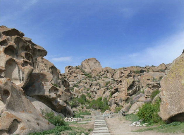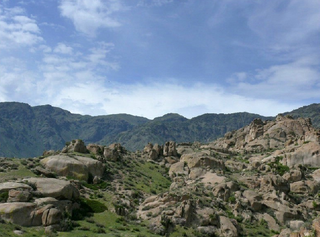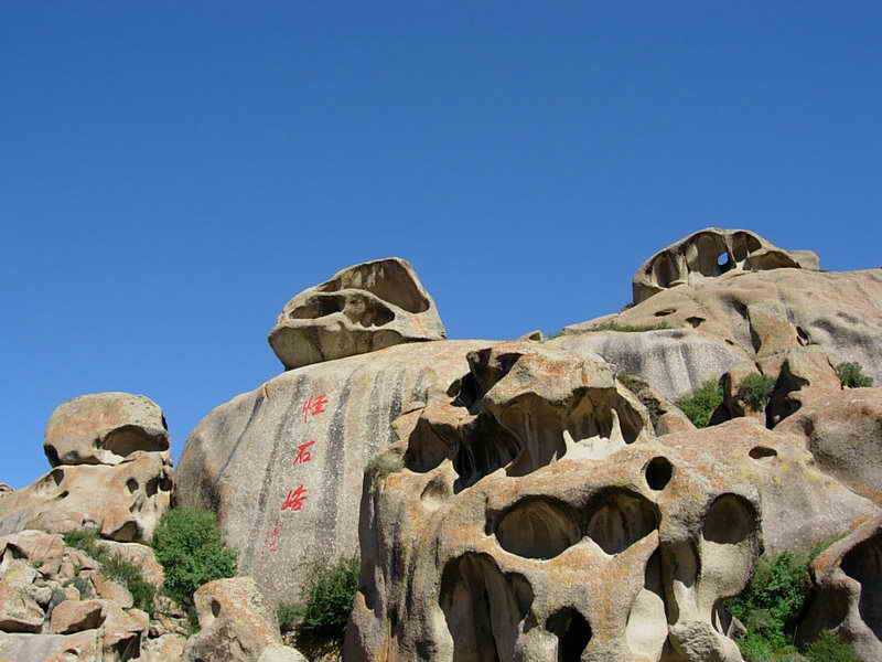 從博樂市北行偏東行38公里,就到了怪石峪。 怪石峪為一峽谷,然谷內(nèi)無懸崖峭壁,也無峨峰刺天。整個山體,如人工用億萬巨石所砌。所砌之石,皆呈圓角,且有竅孔,石面光滑,無嶙峋之跡,令人稱怪,故稱“怪石峪”。當?shù)毓_克族同胞稱怪石峪為“闊依塔什”,意思是“遍地像羊一樣的石頭”。因為這些光滑的巨石,遠遠望去,如同羊群擠在山坡。