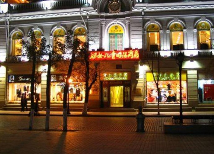 原為俄國商人伊•雅•秋林開辦的秋林商行道里分行。建于20世紀初期,磚木結(jié)構(gòu),仿文藝復(fù)興建筑風(fēng)格。首層以連續(xù)的腰線分割,墻面采用仿塊石砌筑,二層為對方額高窗,窗口上有石膏花飾,與一層的大玻璃窗相對應(yīng)。檐上做間斷的女兒墻,上面飾以巴洛克式浮雕,建筑頂部的轉(zhuǎn)角突出,屋頂輪廓富有變化,檐口下有精美的裝飾造型。哈爾濱Ⅱ類保護建筑。
