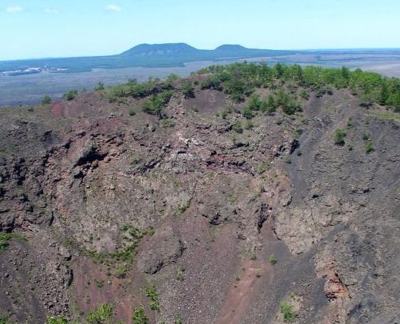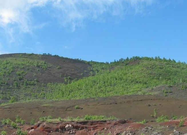 黑龍山南坡覆蓋的是火山礫,也稱火山灰?;鹕降[是氣體噴發(fā)的產(chǎn)物,當(dāng)巖漿中氣體特別充沛時(shí),就噴發(fā)出泡沫狀的熔巖,冷凝后,隨著風(fēng)向散落在火山周圍。根據(jù)火山礫的分布情況,可以推測(cè)火山噴發(fā)時(shí)這里刮的是北風(fēng)或西北風(fēng)。山體由早、晚兩個(gè)火山錐體套疊而成,早期的錐體被晚期的噴發(fā)破壞并占據(jù),從植被的疏密上可以看出早晚的差別,它是一座休眠活火山。