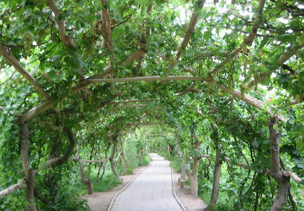 葡萄溝,是火洲的“桃花源”。溝里四處都有令人向往的地方,一是葡萄溝接待站。這是為中外賓客開(kāi)辟的游覽場(chǎng)所,依山傍水,安靜、幽雅,景物天成,數(shù)條葡萄長(zhǎng)廊深邃、幽靜,有的游客信步葡萄架下,仰首盡情觀(guān)嘗珍珠般的葡萄,有的游人坐在葡萄架下品嘗鮮葡萄。長(zhǎng)廊盡頭碑石上葡萄溝三個(gè)鮮紅大字,格外引人注目,游人爭(zhēng)先恐后在此照相留念。園內(nèi)有民族風(fēng)味的食堂,有賣(mài)工藝品的蒙古包,還有劃船游玩的地方。二是葡萄山莊。版權(quán)所有聊城聊之旅國(guó)際旅行社有限公司,轉(zhuǎn)載必究!這是葡萄溝里設(shè)備齊全、級(jí)別較高的度假村。這里有高檔次床位120個(gè),有供120人就餐的飯廳,還有卡拉ok廳、游泳池等。三是吐魯番葡萄展覽館。四是吐魯番維吾爾族民居民俗館。五是中新公司,該公司是以葡萄為主要原料生產(chǎn)葡萄酒和飲料的中外合資廠(chǎng)家。六是葡萄鄉(xiāng)的度假村。