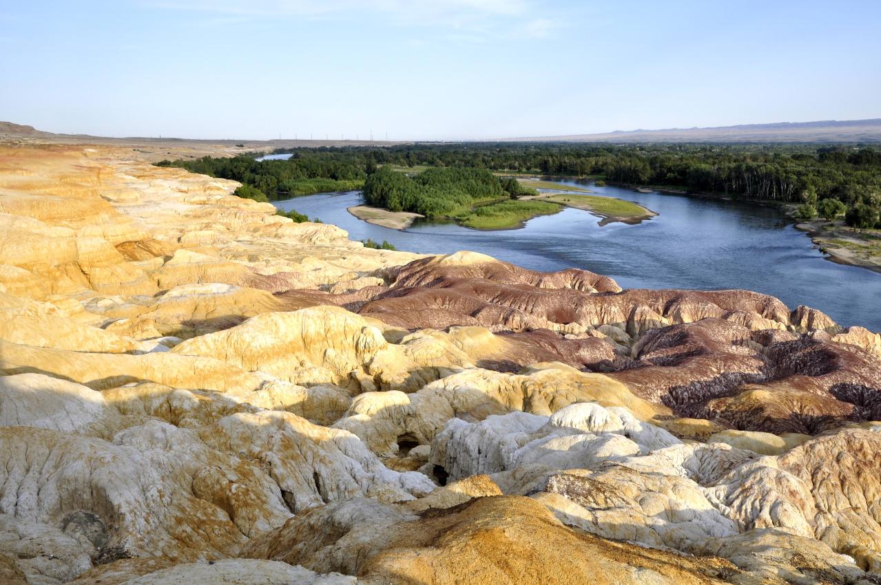 五彩灘位于布爾津縣城以北約24公里處,是前往哈巴河縣與喀納斯的必經(jīng)之路。它毗鄰碧波蕩漾的額爾齊斯河,與對(duì)岸蔥郁青翠的河谷風(fēng)光遙相輝映,可謂“一河隔兩岸,自有兩重天”。激猛的河流沖擊以及狂風(fēng)侵蝕,形成了北岸的懸崖式雅丹地貌,河岸巖層抗風(fēng)化能力強(qiáng)弱不一,輪廓便會(huì)參差不齊,而巖石含有礦物質(zhì)的不同,又幻化出種種異彩,因此得名“五彩灘”。 版權(quán)所有聊城聊之旅國(guó)際旅行社有限公司,轉(zhuǎn)載必究!而南岸卻是綠樹葳蕤,連綿成林,遠(yuǎn)處逶迤的山巒與戈壁風(fēng)光盡收眼底。