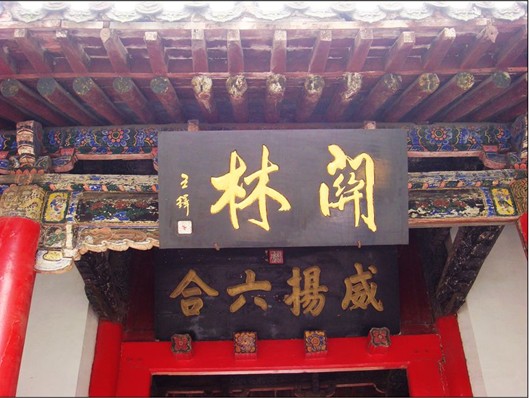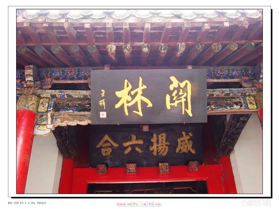 始建于明萬歷二十四年(1596年),面闊七間,進(jìn)深三間,高26米。廡殿頂,琉璃瓦覆蓋,五脊橫立,六獸揚(yáng)威。正門上,有12幅明代浮雕木刻。說的是桃園三結(jié)義,三英戰(zhàn)呂布等故事。