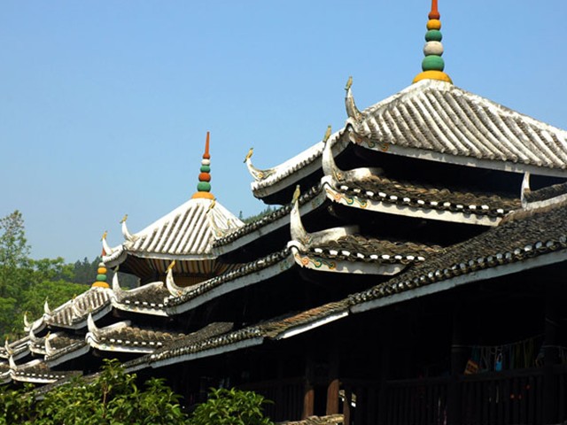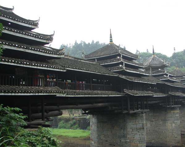 地坪坪風(fēng)雨橋又名花橋,始建于清光緒二十年(1894年)。橋總長70米,高出水面8米,寬4.5米,河中立一青石石墩。橋為木質(zhì)結(jié)構(gòu),橋的下部由兩排各為8根粗大杉木穿榫連成一體,分兩層呈天平狀向邊懸掛。每層挑出約兩米。橋廊兩側(cè)有一米高的梳齒欄桿。欄桿外面又有一層外桃1.4米的挑檐。橋廊內(nèi)兩側(cè)下面設(shè)置連通板凳供人歇憩。 看地坪風(fēng)雨橋真正要看的是它的裝飾。地坪風(fēng)雨橋上部為花板,繪有各種侗族風(fēng)慶人物故事山水、花木、動物等彩畫。此外,“樓葉,樓”四柱繪有4條青龍抱柱,版權(quán)所有山東聊城聊之旅國際旅行社有限公司,轉(zhuǎn)載必究!頂層花板又繪有龍虎鶴牛齊歡圖案。橋兩頭柱壁上畫了三幅楹聯(lián)。 另外在北面的平地上配建有——座風(fēng)雨主亭,高約9米,為6角攢尖頂,同樣具有濃厚的民族特色.