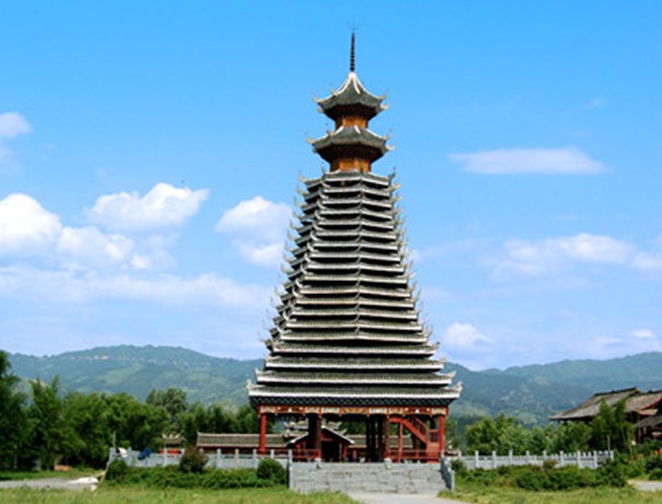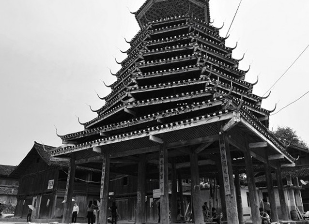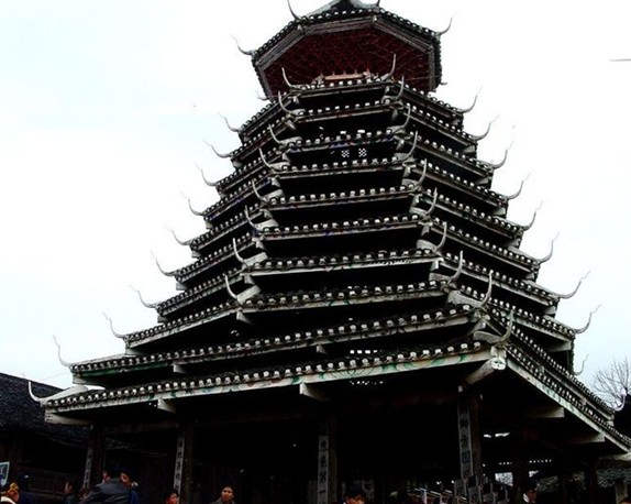 紀(jì)堂鼓樓位于貴州省黎平縣肇興鄉(xiāng)紀(jì)堂寨上,共3座。十分雄偉壯觀,1982年,紀(jì)堂鼓樓被列為省級(jí)重點(diǎn)文物保護(hù)單位。紀(jì)堂分上寨下寨,各有一座鼓樓,由十二根大杉樹原木支撐而起。塔身分八角,而頂層卻變化為四角攢尖頂花重檐。鼓樓周圍的地面和民居的走道上都以卵石鑲嵌成象征喜慶吉祥的圖案。紀(jì)堂鼓樓建筑年代久遠(yuǎn),曾多次修葺。1966年遭到破壞,1978年當(dāng)?shù)囟弊迦嗣褡栽斧I(xiàn)工獻(xiàn)料重新修復(fù)。塘明鼓樓由12根大杉木立于柱礎(chǔ)之上,高約22米,突兀寨中。該樓以逐層內(nèi)收的梁枋和全爪柱支撐層層挑出層檐,形如寶塔,內(nèi)無層板,空至寶頂。鼓樓基面約160平方米,中央用青石板鑲成一個(gè)火塘,周圍有簡(jiǎn)易木凳。樓前有一歌坪,坪邊建有一個(gè)小巧玲瓏的侗戲臺(tái),與鼓樓相對(duì)。該樓底層呈方形,上為八角形,共有9重檐,為四角攢尖頂。版權(quán)所有山東聊城聊之旅國(guó)際旅行社有限公司,轉(zhuǎn)載必究!鐵制寶頂下有如意斗裝飾。檐面鋪小青瓦。屋脊白色,翼角高翹而起,裝有套獸,塑有獅、虎、鳳、猴、兔、蛇、蟲、鳥等動(dòng)物雕塑裝飾。樓內(nèi)亦雕梁畫棟。樓上一二層檐之間有“二龍戲珠”木雕,大門上有“幸福堂”金字匾額,耀眼奪目。